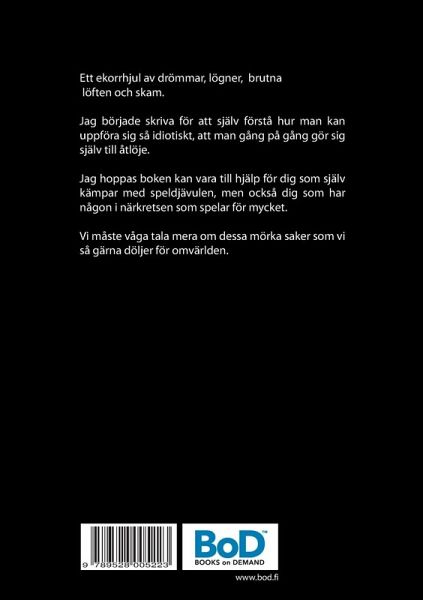 En sann historia om hur det kan gå då man är beroende av spel. Jag vill berätta hur jag resonerade då jag var helt besatt med att fixa situationen jag försatt mig själv och min familj i. Jag hoppas du känner att jag sitter framför dig och berättar min historia, och att du upplever känslor från lite fniss till ilska. Jag började skriva boken för att försöka förstå varifrån allt kommer. Nu hoppas jag att den kan hjälpa dig som själv kämpar med spel. För dig som är närstående till någon som spelar för mycket hoppas jag att boken öppnar lite hur vi resonerar. Fast vi kanske utåt vill visa att allt är ok, gömmer det sig en massor med desperation och skam inombords. Jag vill att vi lär oss tala om dessa svåra saker som vi så ofta bara försöker gömma undan. Jag känner att talandet är ett första steg upp från träsket.