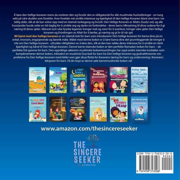 Koranen for barn: Lær og elsk Den hellige Koranen Gi barnet ditt en verdifull gave - kjærligheten til Den hellige Koranen. Denne vakkert illustrerte islamiske barneboken gjør Koranens budskap lettforståelig og inspirerende for unge muslimer. Hva boken inneholder: ¿Historien om Koranens åpenbaring ¿Barnevennlige forklaringer av Koranens budskap ¿Historier som fremmer islamske verdier ¿Fargerike illustrasjoner ¿Interaktive læringselementer ¿Leksjoner om bønn, vennlighet og takknemlighet Perfekt for: ¿Muslimske barn (5-12 år) ¿Foreldre som underviser Koranen hjemme ¿Islamske skoler og weekend-Madrasah ¿Familieaktiviteter under Ramadan ¿Islamsk karakterutvikling ¿Ramadan- og Eid-gaver ¿Godnatthistorier Om The Sincere Seeker Kids Collection: Sincere Seeker Kids Collection tilbyr vakkert illustrerte islamske barnebøker for muslimske barn. Getting to Know & Love the Holy Quran: A Children's Book Introducing the Holy Quran Introduce your child to the beauty and wisdom of the Quran with this engaging and educational Islamic book! Getting to Know & Love the Holy Quran is a beautifully illustrated Islamic book designed to help young Muslims understand Quranic values, messages, and lessons in a simple and engaging way. What's Inside: ¿The story of how the Quran was revealed to Prophet Muhammad ¿ ¿Quranic teachings explained in child-friendly language ¿Character-building stories promoting good morals ¿Vibrant illustrations bringing Islamic lessons to life ¿Interactive elements to make Quran learning engaging Perfect For: ¿Muslim children (ages 5-12) beginning their Quran journey ¿Parents introducing Quran teachings at home ¿Islamic schools, weekend Madrasah, and Quran lessons ¿Family activities during Ramadan ¿Islamic character-building and good manners ¿Ramadan and Eid gifts for young Muslims Why Families Love This Book: ¿Makes Quran learning fun and accessible ¿Beautiful illustrations capture children's attention ¿Encourages daily Quran reading habits ¿Builds a strong Islamic foundation ¿Perfect for bedtime stories and family storytime About the Sincere Seeker Kids Collection: The Sincere Seeker Kids Collection offers beautifully illustrated books for Muslim children ages two and up. These books make Islamic education fun, engaging, and memorable. Start Your Child's Quranic Journey Today! Click "Add to Cart" now to give your child the precious gift of Quranic knowledge!