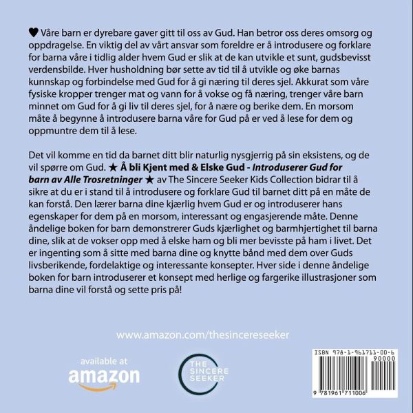 ¿ Våre barn er dyrebare gaver gitt til oss av Gud. Han betror oss deres omsorg og oppdragelse. En viktig del av vårt ansvar som foreldre er å introdusere og forklare for barna våre i tidlig alder hvem Gud er slik at de kan utvikle et sunt, gudsbevisst verdensbilde. Hver husholdning bør sette av tid til å utvikle og øke barnas kunnskap og forbindelse med Gud for å gi næring til deres sjel. Akkurat som våre fysiske kropper trenger mat og vann for å vokse og få næring, trenger våre barn minnet om Gud for å gi liv til deres sjel, for å nære og berike dem. En morsom måte å begynne å introdusere barna våre for Gud på er ved å lese for dem og oppmuntre dem til å lese. Det vil komme en tid da barnet ditt blir naturlig nysgjerrig på sin eksistens, og de vil spørre om Gud. ¿ Å bli Kjent med & Elske Gud - Introduserer Gud for barn av Alle Trosretninger ¿ av The Sincere Seeker Kids Collection bidrar til å sikre at du er i stand til å introdusere og forklare Gud til barnet ditt på en måte de kan forstå. Den lærer barna dine kjærlig hvem Gud er og introduserer hans egenskaper for dem på en morsom, interessant og engasjerende måte. Denne åndelige boken for barn demonstrerer Guds kjærlighet og barmhjertighet til barna dine, slik at de vokser opp med å elske ham og bli mer bevisste på ham i livet. Det er ingenting som å sitte med barna dine og knytte bånd med dem over Guds livsberikende, fordelaktige og interessante konsepter. Hver side i denne åndelige boken for barn introduserer et konsept med herlige og fargerike illustrasjoner som barna dine vil forstå og sette pris på!