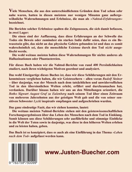 Viele Menschen, die aus den unterschiedlichsten Gründen dem Tod schon sehr nahe waren, hatten in diesen meistens nur wenigen Minuten ganz außergewöhnliche Wahrnehmungen und Erlebnisse, die man als »Nahtod-Erfahrungen« bezeichnet.Die Berichte solcher Erlebnisse spalten die Zeitgenossen, die sich damit befassen, in zwei Lager: Die einen sind der Auffassung, dass diese Erfahrungen an der Schwelle des Todes ein Beweis oder zumindest ein starkes Indiz dafür seien, dass es ein Bewusstsein gibt, das nicht an das physische Gehirn gebunden ist und dass es somit wahrscheinlich sei, dass die menschliche Existenz durch den Tod nicht ausgelöscht werde. Die wohl weitaus meisten halten diese Wahrnehmungen für nichts anderes als Halluzinationen oder Phantastereien. Für dieses Buch haben wir die Nahtod-Berichte von rund 400 Persönlichkeiten studiert, nach ihren wichtigsten Motiven geordnet und analysiert.Das wohl Einzigartige dieses Buches ist, dass wir diese Schilderungen mit den Erkenntnissen verglichen haben, die wir Geistessehern - allen voran Rudolf Steiner - über dasjenige, was der Mensch nach dem tatsächlichen und unwiderruflichen Tod in den übersinnlichen Welten erlebt, erfährt und durchzumachen hat, verdanken. Darüber hinaus haben wir uns an den Mitteilungen orientiert, die Botho Sigwart August Graf zu Eulenberg nach seinem Tod über einen Zeitraum von mehreren Jahrzehnten aus der geistigen Welt gab und die von seiner sensitiven Schwester Lycki inspirativ empfangen und aufgeschrieben wurden.Das ganz eindeutige Fazit, das wir ziehen konnten, lautet: Die weitaus meisten Nahtod-Berichte stehen mit den geisteswissenschaftlichen Forschungsergebnissen über das Leben des Menschen nach dem Tod in Einklang. Somit können uns diese Schilderungen sehr ausführliche und stimmige Einblicke in die Welt der Toten sowie in dasjenige, was diese in den höheren Welten erleben und zu leisten haben, geben.Das Buch ist so konzipiert, dass es auch als eine Einführung in das Thema »Leben nach dem Tod« aufgefasst werden kann.