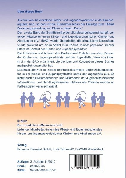 "So bunt wie die einzelnen Kinder- und Jugendpsychiatrien in der Bundesrepublik sind, so bunt ist die Zusammenschau der Beiträge zum Thema Beziehungsgestaltung mit Eltern in diesem Buch."Der zweite Band der Schriftenreihe der "Bundesarbeitsgemeinschaft Leitender Mitarbeiter/-innen Kinder- und jugendpsychiatrischer Kliniken und Abteilungen e.V." (BAG).wurde überarbeitet, die aktualisierte Neuauflage wurde erweitert um einen Artikel zum Thema "Kinder psychisch kranker Eltern im Kontext der Kinder- und Jugendpsychiatrie". Die Autorinnen und Autoren des Buches sind Praktiker aus dem Bereich der Kinder- und Jugendpsychiatrie und der Jugendhilfe. Viele von ihnen sind in der BAG organisiert, die die Idee und Konzeption dieses Buches maßgeblich unterstützt hat.Das Buch geht von der klinischen Praxis des Pflege- und Erziehungsdienstes in der Kinder- und Jugendpsychiatrie sowie der Jugendhilfe aus. Es bietet auch für Mitarbeiterinnen und Mitarbeiter der Jugendhilfe hilfreiche Informationenund Handlungshinweise. Nahezu alle Themen werden an Fallbeispielen veranschaulicht.