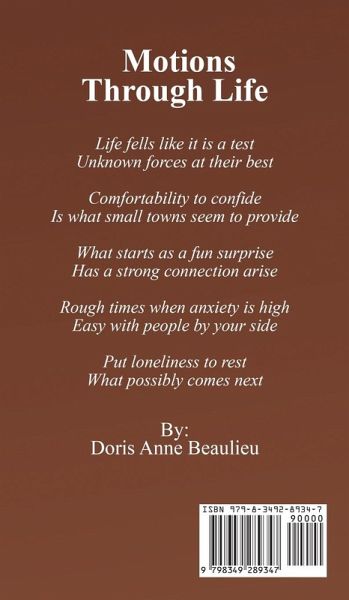Motions Through Life Life fells like it is a test Unknown forces at their best Comfortability to confide Is what small towns seem to provide What starts as a fun surprise Has a strong connection arise Rough times when anxiety is high Easy with people by your side Put loneliness to rest What possibly comes next By: Doris Anne Beaulieu