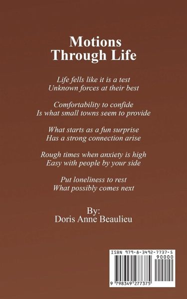 Motions Through Life Life fells like it is a test Unknown forces at their best Comfortability to confide Is what small towns seem to provide What starts as a fun surprise Has a strong connection arise Rough times when anxiety is high Easy with people by your side Put loneliness to rest What possibly comes next By: Doris Anne Beaulieu