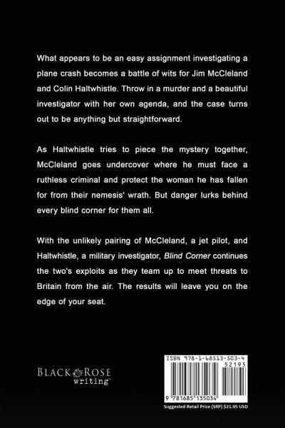 What appears to be an easy assignment investigating a plane crash becomes a battle of wits for Jim McCleland and Colin Haltwhistle. Throw in a murder and a beautiful investigator with her own agenda, and the case turns out to be anything but straightforward. As Haltwhistle tries to piece the mystery together, McCleland goes undercover where he must face a ruthless criminal and protect the woman he has fallen for from their nemesis' wrath. But danger lurks behind every blind corner for them all. With the unlikely pairing of McCleland, a jet pilot, and Haltwhistle, a military investigator, Blind Corner continues the two's exploits as they team up to meet threats to Britain from the air. The results will leave you on the edge of your seat.