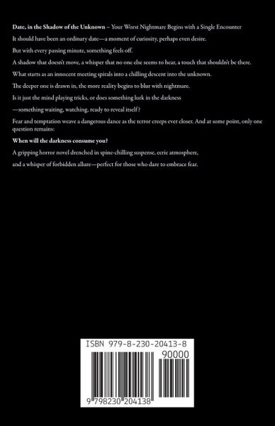 Date, in the Shadow of the Unknown - Your Worst Nightmare Begins with a Single Encounter It should have been an ordinary date-a moment of curiosity, perhaps even desire. But with every passing minute, something feels off. A shadow that doesn't move, a whisper that no one else seems to hear, a touch that shouldn't be there. What starts as an innocent meeting spirals into a chilling descent into the unknown. The deeper one is drawn in, the more reality begins to blur with nightmare. Is it just the mind playing tricks, or does something lurk in the darkness -something waiting, watching, ready to reveal itself? Fear and temptation weave a dangerous dance as the terror creeps ever closer. And at some point, only one question remains: When will the darkness consume you? A gripping horror novel drenched in spine-chilling suspense, eerie atmosphere, and a whisper of forbidden allure-perfect for those who dare to embrace fear.