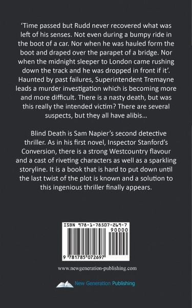 'Time passed but Rudd never recovered what was left of his senses. Not even during a bumpy ride in the boot of a car. Nor when he was hauled form the boot and draped over the parapet of a bridge. Nor when the midnight sleeper to London came rushing down the track and he was dropped in front if it'. Haunted by past failures, Superintendent Tremayne leads a murder investigation which is becoming more and more difficult. There is a nasty death, but was this really the intended victim? There are several suspects, but they all have alibis... Blind Death is Sam Napier's second detective thriller. As in his first novel, Inspector Stanford's Conversion, there is a strong Westcountry flavour and a cast of riveting characters as well as a sparkling storyline. It is a book that is hard to put down until the last twist of the plot is known and a solution to this ingenious thriller finally appears.