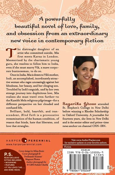 The distraught daughter of an artist who committed suicide, Mia first meets Karna in London. Mesmerized by the charismatic young guru, she resolves to follow him to India, even if she must marry Vik, a suave corporate businessman, to do so. Once in India, Mia is drawn to Vik's mother, Indi, an accomplished, inordinately attractive woman who rages unceasingly against her blindness, her beauty, and her clinging son. Troubled by Indi's anguish, and by her own strange journey into duplicitous love, Mia realizes she must travel even further--to the Kumb Mela religious pilgrimage--for a different perspective on her clouded and confused life. Brilliant, bold, heartfelt, and transcendent, Blind Faith is a provocative reexamination of the human condition, of reason that binds, hate that liberates, and love that strangles.