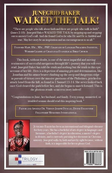 Junegrid Baker walked the talk! "There are people who talk about faith and there are people who walk in faith" (James 2:18). Junegrid Baker WALKED THE TALK by stepping up and stepping out to answer God's call. And she found God to be who He said He is: faithful and true. May her story be an inspiration and an encouragement to us all." Danford Mapp, BSc., MSc., PMP, Graduate of Langham Preaching Institute, Worship Leader at Chaguanas Evangelical Bible Church This book, without doubt, is one of the most impactful and moving testimonies of successful navigation through life's journey that you will ever read. Junegrid Baker has told the truth and nothing but the truth in this epic account of her life. Hers is a depiction of amazing grit and determination, like Jonathan and his armor bearer climbing up the steep and dangerous ridge in pursuit of victory over the massive garrisons of the Philistines, perched to attack Israel from the hill, as found in 1 Samuel 13-14. She never looked back once God cleared the path before her, and she began to march forward. This is the glorious result-a success story indeed! "Congratulations to June, her husband, and family. Every young, unmarried, or troubled woman should read this inspiring book." Pastor and Apostle Dr. Vernon Joseph Duncan, Divine Encounter Fellowship Ministries International