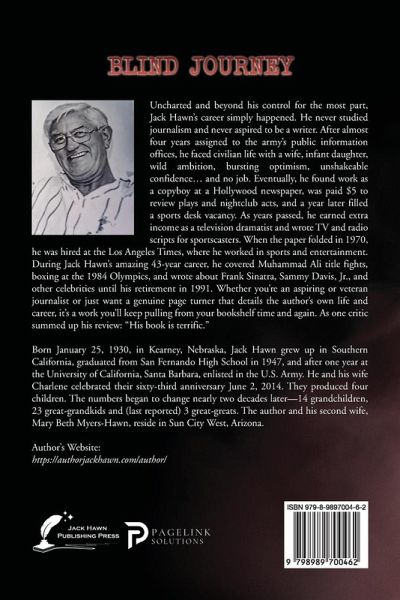Uncharted and beyond his control for the most part, Jack Hawn's career simply happened. He never studied journalism and never aspired to be a writer. After almost four years assigned to the army's public information offices, he faced civilian life with a wife, infant daughter, wild ambition, bursting optimism, unshakeable confidence... and no job. Eventually, he found work as a copy boy at a Hollywood newspaper, was paid $5 to review plays and nightclub acts, and a year later filled a sports desk vacancy. As years passed, he earned extra income as a television dramatist and wrote TV and radio scripts for sportscasters. When the paper folded in 1970, he was hired at the Los Angeles Times, where he worked in sports and entertainment. During Jack Hawn's amazing 43-year career, he covered Muhammad Ali title fights, boxing at the 1984 Olympics, and wrote about Frank Sinatra, Sammy Davis, Jr., and other celebrities until his retirement in 1991. Whether you're an aspiring or veteran journalist or just want a genuine page turner that details the author's own life and career, it's a work you'll keep pulling from your bookshelf time and again. As one critic summed up his review: "His book is terrific."
