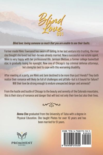 Blind love: loving someone so much that you are unable to see their faults. Former model Nikki Townsend has sworn off dating. In her last venture into trusting, the man she thought she loved had lied-he was already married. Now a successful real estate agent, Nikki is very happy with her professional life. Jamison Bledsoe, a former college basketball star, is gradually losing his eyesight. Now one of Chicago's top criminal defense attorneys, he's doing his best to cope with this worsening disability. After meeting at a party, are Nikki and Jami destined to be more than just friends? They both realize their romance will likely be full of challenges and pitfalls-but is it bound for failure? Will their love be strong enough to endure unexpected danger and amnesia? From the hustle and bustle of Chicago to the beauty and serenity of the Colorado mountains, this is their story of romance and danger that will test not only their love but also their lives.