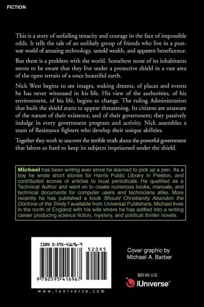 This is a story of unfailing tenacity and courage in the face of impossible odds. It tells the tale of an unlikely group of friends who live in a post-war world of amazing technology, untold wealth, and apparent beneficence. But there is a problem with the world. Somehow none of its inhabitants seems to be aware that they live under a protective shield in a vast area of the open terrain of a once beautiful earth. Nick West begins to see images, waking dreams, of places and events he has never witnessed in his life. His view of the authorities, of his environment, of his life, begins to change. The ruling Administration that built the shield starts to appear threatening. Its citizens are unaware of the nature of their existence, and of their government; they passively indulge in every government program and activity. Nick assembles a team of Resistance fighters who develop their unique abilities. Together they work to uncover the terrible truth about the powerful government that labors so hard to keep its subjects imprisoned under the shield.