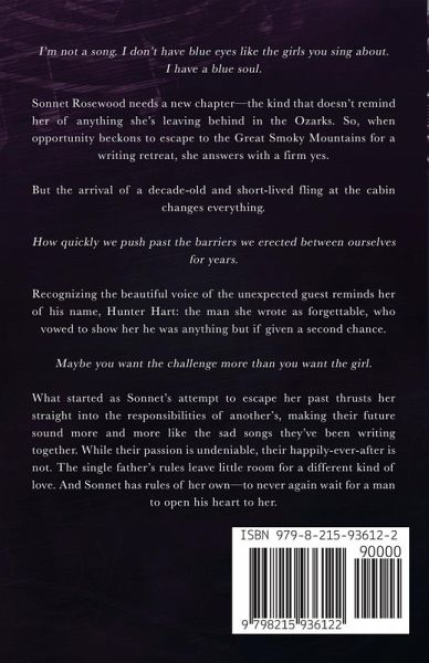 I'm not a song. I don't have blue eyes like the girls you sing about. I have a blue soul. Sonnet Rosewood needs a new chapter-the kind that doesn't remind her of anything she's leaving behind in the Ozarks. So, when opportunity beckons to escape to the Great Smoky Mountains for a writing retreat, she answers with a firm yes. But the arrival of a decade-old and short-lived fling at the cabin changes everything. How quickly we push past the barriers we erected between ourselves for years. Recognizing the beautiful voice of the unexpected guest reminds her of his name, Hunter Hart: the man she wrote as forgettable, who vowed to show her he was anything but if given a second chance. Maybe you want the challenge more than you want the girl. What started as Sonnet's attempt to escape her past thrusts her straight into the responsibilities of another's, making their future sound more and more like the sad songs they've been writing together. While their passion is undeniable, their happily-ever-after is not. The single father's rules leave little room for a different kind of love. And Sonnet has rules of her own-to never again wait for a man to open his heart to her.