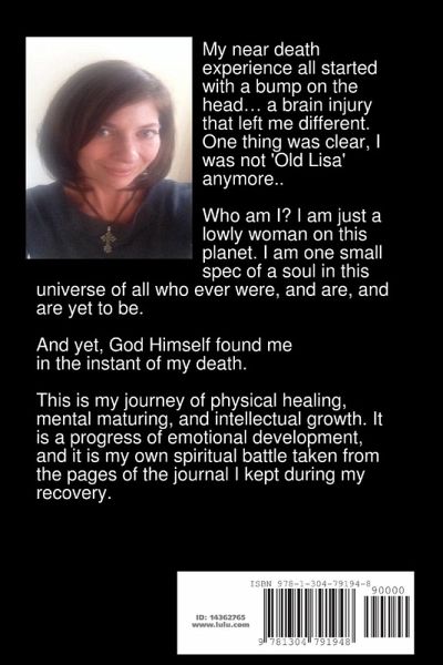 My near death experience all started with a bump on the head.. ...A brain injury that left me different. One thing was clear, I was not 'Old Lisa' anymore.. This is my journey of physical healing, mental maturing, and intellectual growth. A journey of emotional development. It is my own spiritual battle taken from the pages of the journal I kept during my recovery.