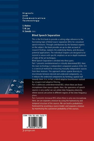 We are surrounded by sounds. Such a noisy environment makes it di?cult to obtain desired speech and it is di?cult to converse comfortably there. This makes it important to be able to separate and extract a target speech signal from noisy observations for both man-machine and human-human communication. Blindsourceseparation(BSS)isanapproachforestimatingsourcesignals using only information about their mixtures observed in each input channel. The estimation is performed without possessing information on each source, such as its frequency characteristics and location, or on how the sources are mixed. The use of BSS in the development of comfortable acoustic com- nication channels between humans and machines is widely accepted. Some books have been published on BSS, independent component ana- sis (ICA), and related subjects. There, ICA-based BSS has been well studied in the statistics and information theory ?elds, for applications to a variety of disciplines including wireless communication and biomedicine. However, as speech and audio signal mixtures in a real reverberant environment are generally convolutive mixtures, they involve a structurally much more ch- lenging task than instantaneous mixtures, which are prevalent in many other applications.