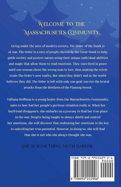 A fast-paced new adult urban romantasy with a unique magic system, mythical creatures, a strong community family, spice, a chosen one, battle scenes, uncovered secrets, light vs. dark, and "who hurt you?". Welcome to the Massachusetts Community. Living under the nose of modern society, The Order of the Hawk is at war. The Order is a race of people chosen by the Great Hawk to help guide society and protect nature using their unique individual abilities and magic that allow them to read emotions. They once lived in peace until one woman chose the wrong man to love, thus making the witch trials…mehr