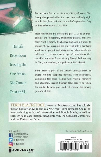 Blind Trust by New York Times bestselling author Terri Blackstock is a gripping romantic suspense about a woman who reunites with the man who abandoned her weeks before their wedding day, discovers the shocking truth of why he ran and that she may also be in grave danger. Two weeks before her wedding, Sherry Grayson's world collapsed when her fiancé, Clint Jessup, disappeared without a trace. Now--eight months later--he's back. No explanation. No details. Only a single, impossible request: trust him. But Clint isn't the man she remembers. Something dark shadows him, something he refuses to reveal, and Sherry soon finds herself drawn into a deadly storm of secrets, danger, and pursuit. As threats close in and Clint's mysterious past catches up with them both, Sherry must confront the fear, betrayal, and doubt threatening to unravel her faith--not only in the man she once loved, but in the people around her . . . and even in God Himself. Every step toward the truth pulls them deeper into a razor-edge battle where deliverance and disaster hinge on choices they can't afford to get wrong. Fast-paced, emotionally charged, and anchored in themes of faith under fire, Blind Trust is a powerful installment in Terri Blackstock's Second Chances series. Start reading Terri Blackstock's Second Chances series (Never Again Good-Bye, When Dreams Cross, Blind Trust, Broken Wings) today, where suspense, heartfelt emotion, and powerful themes of faith intersect in unforgettable stories.