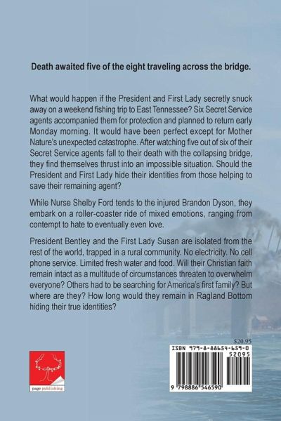 What would happen if the President and First Lady secretly snuck away on a weekend fishing trip to East Tennessee? Six Secret Service agents accompanied them for protection and planned to return early Monday morning. It would have been perfect except for Mother Nature's unexpected catastrophe. After watching five out of six of their Secret Service agents fall to their death with the collapsing bridge, they find themselves thrust into an impossible situation. Should the President and First Lady hide their identities from those helping to save their remaining agent? While Nurse Shelby Ford tends to the injured Brandon Dyson, they embark on a roller-coaster ride of mixed emotions, ranging from contempt to hate to eventually even love. President Bentley and the First Lady Susan are isolated from the rest of the world, trapped in a rural community. No electricity. No cell phone service. Limited fresh water and food. Will their Christian faith remain intact as a multitude of circumstances threaten to overwhelm everyone? Others had to be searching for America's first family? But where are they? How long would they remain in Ragland Bottom hiding their true identities?