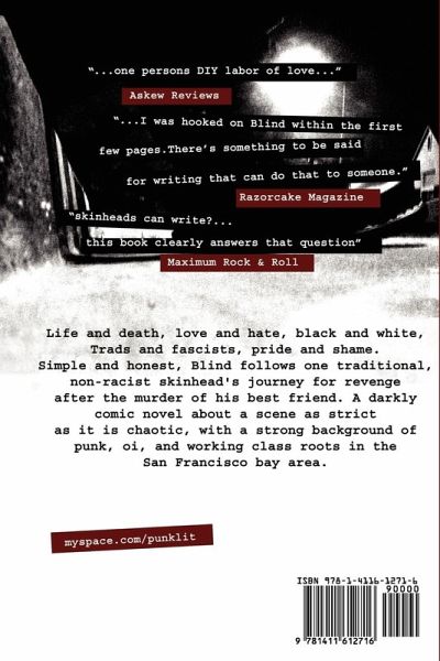 Blind follows one traditional, non-racist skinhead's journey for revenge after the murder of his best friend. A darkly comic novel about a scene as strict as it is chaotic, with a strong background of punk, oi, and working class roots in the San Francisco bay area. Contains some graphic language and content.