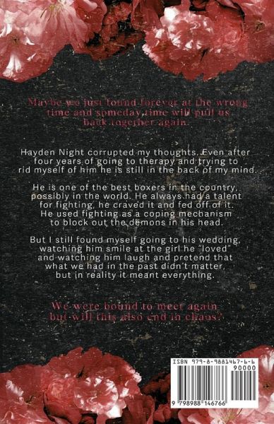 Maybe we just found forever at the wrong time and someday time will pull us back together again. Hayden Night corrupted my thoughts. Even after four years of going to therapy and trying to rid myself of him he is still in the back of my mind. He is one of the best boxers in the country, possibly in the world. He always had a talent for fighting, he craved it and fed off of it. He used fighting as a coping mechanism to block out the demons in his head. But I still found myself going to his wedding, watching him smile at the girl he "loved" and watching him laugh and pretend that what we had in the past didn't matter, but in reality it meant everything. We were bound to meet again but will this also end in chaos?