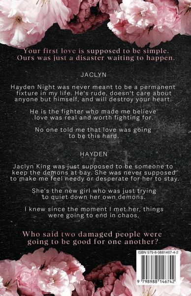 Your first love is suppose to be simple. Ours was just a disaster waiting to happen. Jaclyn Hayden Night was never meant to be a permeant fixture in my life. He's rude, doesn't care about anyone but himself, and will destroy your heart. He is the fighter who made me believe love was real and worth fighting for. No one told me that love was going to be this hard. Hayden Jaclyn King was just suppose to be someone to keep the demons at bay. She was never suppose to make me feel needy or desperate for her to stay. She's the new girl who was just trying to quiet down her own demons. I knew since the moment I met her, things were going to end in chaos. Who said two damaged people were going to be good for one another?