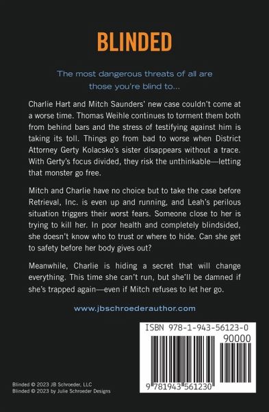 The most dangerous threats of all are those you're blind to… Charlie Hart and Mitch Saunders' new case couldn't come at a worse time. Thomas Weihle continues to torment them both from behind bars and the stress of testifying against him is taking its toll. Things go from bad to worse when District Attorney Gerty Kolacsko's sister disappears without a trace. With Gerty's focus divided, they risk the unthinkable—letting that monster go free. Mitch and Charlie have no choice but to take the case before Retrieval, Inc. is even up and running, and Leah's perilous situation triggers their worst fears. Someone close to her is trying to kill her. In poor health and completely blindsided, she doesn't know who to trust or where to hide. Can she get to safety before her body gives out? Meanwhile, Charlie is hiding a secret that will change everything. This time she can't run, but she'll be damned if she's trapped again—even if Mitch refuses to let her go. . . . . . . . Retrieval, Inc Series: RUNAWAY - Book 1 TRAPPED - Book 2 BLINDED - Book 3 The Retrieval, Inc. series is gritty, edgy, fast-paced, and emotional! Books can be read stand-alone—but you'll want to read the whole series! What readers say about BLINDED: "Blinded is a beautifully written tale wrought with suspense, intrigue, and danger… full of twist and turns and interesting characters all enhanced by a well-developed plot." —Di, 5 Stars "An edge-of-your-seat page-turner... The characters are well-developed and believable. The story's suspense keeps the reader guessing until the very end." —Teresa, 5 Stars "The compelling relationship between Charlie and Mitch's love story continues with more depth and challenges… Once again, author JB writes a page turner…that I couldn't get enough of!" Rick, 5 Stars "Will keep you guessing. The characters are very real. The story holds your interest with every page and makes you want to find out more." —Donald, 5 Stars "I love this series. This was a page turner, an emotional roller coaster and heart wrenching as Charlie and Mitch try to solve the case and build their relationship." —Cheryl, 4.5 Stars "An outstanding book that will keep you up to finish it. Fast paced, suspenseful with strong characters that take you through the secrets and mystery. Can't wait for the next." —Jackie, 5 Stars