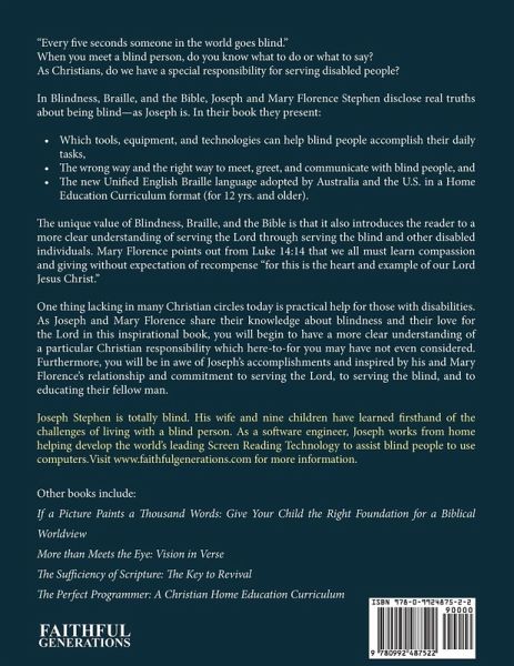 "Every five seconds someone in the world goes blind." When you meet a blind person, do you know what to do or what to say? As Christians, do we have a special responsibility for serving disabled people? In Blindness, Braille, and the Bible, Joseph and Mary Florence Stephen disclose real truths about being blind-as Joseph is. In their book they present: • Which tools, equipment, and technologies can help blind people accomplish their daily tasks, • The wrong way and the right way to meet, greet, and communicate with blind people, and • The new Unified English Braille language adopted by Australia and the U.S. in a Home Education Curriculum format (for 12 yrs. and older). The unique value of Blindness, Braille, and the Bible is that it also introduces the reader to a more clear understanding of serving the Lord through serving the blind and other disabled individuals. Mary Florence points out from Luke 14:14 that we all must learn compassion and giving without expectation of recompense "for this is the heart and example of our Lord Jesus Christ." One thing lacking in many Christian circles today is practical help for those with disabilities. As Joseph and Mary Florence share their knowledge about blindness and their love for the Lord in this inspirational book, you will begin to have a more clear understanding of a particular Christian responsibility which here-to-for you may have not even considered. Furthermore, you will be in awe of Joseph's accomplishments and inspired by his and Mary Florence's relationship and commitment to serving the Lord, to serving the blind, and to educating their fellow man.