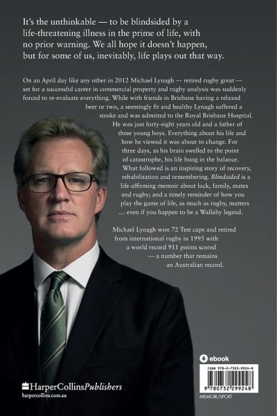 It's the unthinkable - to be blindsided by a life-threatening illness in the prime of life, with no prior warning. We all hope it doesn't happen, but for some of us, inevitably, life plays out that way. On an April day like any other in 2012 Michael Lynagh - retired rugby great - set for a successful career in commercial property and rugby analysis was suddenly forced to re evaluate everything. While with friends in Brisbane having a relaxed beer or two, a seemingly fit and healthy Lynagh suffered a stroke and was admitted to the Royal Brisbane Hospital. He was just forty-eight years old and a father of three young boys. Everything about his life and how he viewed it was about to change. For three days, as his brain swelled to the point of catastrophe, his life hung in the balance. What followed is an inspiring story of recovery, rehabilitation and remembering. Blindsided is a life-affirming memoir about luck, family, mates and rugby; and a timely reminder of how you play the game of life, as much as rugby, matters ... even if you happen to be a Wallaby legend. Michael Lynagh won 72 Test caps and retired from international rugby in 1995 with a world record 911 points scored - a number that remains an Australian record.