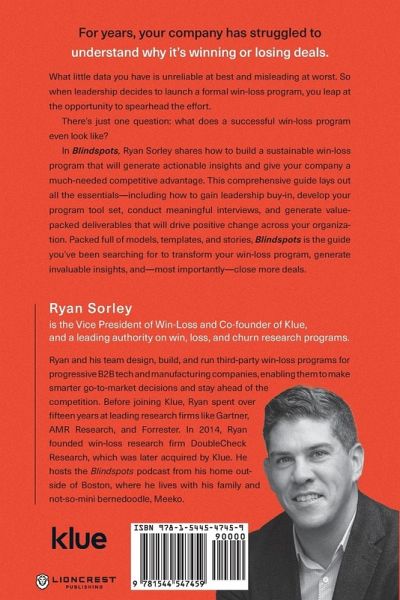 For years, your company has struggled to understand why it's winning or losing deals. What little data you have is unreliable at best and misleading at worst. So when leadership decides to launch a formal win-loss program, you leap at the opportunity to spearhead the effort. There's just one question: what does a successful win-loss program even look like? In Blindspots, Ryan Sorley shares how to build a sustainable win-loss program that will generate actionable insights and give your company a much-needed competitive advantage. This comprehensive guide lays out all the essentials-including how to gain leadership buy-in, develop your program tool set, conduct meaningful interviews, and generate value-packed deliverables that will drive positive change across your organization. Packed full of models, templates, and stories, Blindspots is the guide you've been searching for to transform your win-loss program, generate invaluable insights, and-most importantly-close more deals.