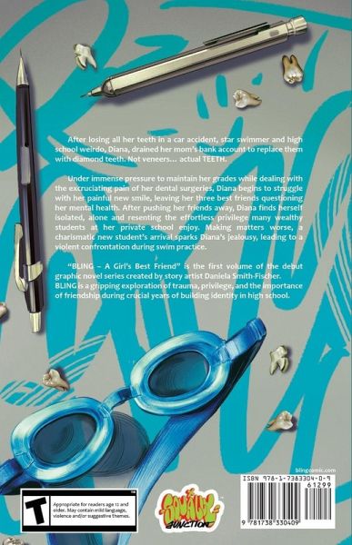 After losing all her teeth in a car accident, star swimmer and high-school weirdo, Diana, drained her mom's bank account to replace them with diamond teeth. Not veneers... actual TEETH. Under immense pressure to maintain her grades while dealing with the excruciating pain of her dental surgeries, Diana begins to struggle with her painful new smile, leaving her three best friends questioning her mental health. After pushing her friends away, Diana finds herself isolated, alone, and resenting the effortless privilege many wealthy students at her private school enjoy. Making matters worse, a charismatic new student's arrival sparks Diana's jealousy, leading to a violent confrontation during swim practice. Did Diana make a huge mistake by getting diamond teeth? Read it and find out. The first volume of the series "BLING", created by story artist Daniela Smith-Fischer, will appeal to fans of young adult graphic novels. Bling is a gripping exploration of trauma, privilege, and the importance of friendship during crucial years of building identity in high school.