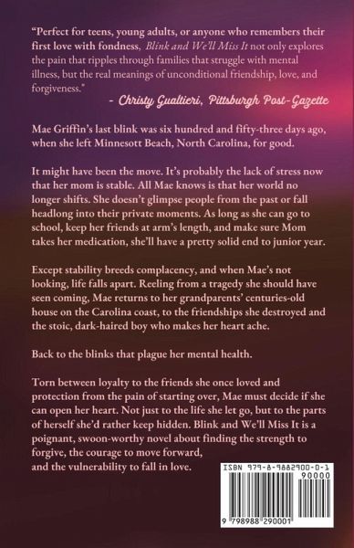 Mae Griffin's last blink was six hundred and fifty-three days ago when she left Minnesott Beach for good. It might have been the move. It's probably the lack of stress now that her mom is stable. All Mae knows is that her world no longer shifts. She doesn't glimpse people from the past or fall headlong into their private moments. As long as she can go to school, keep her friends at arm's length, and make sure Mom takes her medication, she'll have a pretty solid end to junior year. Except stability breeds complacency, and when Mae's not looking, life falls apart. Reeling from a tragedy she should have seen coming, Mae returns to her grandparents' centuries-old house on the Carolina coast, to the friendships she destroyed and the stoic, dark-haired boy who makes her heart ache. Back to the blinks that plague her mental health. As Mae's blinks ramp up in intensity and frequency, she discovers an unsettling truth. Her greatest fear is the key to healing old, brutal wounds and unearthing family secrets that sparked a bitter feud. Torn between loyalty to the friends she once loved and protection from the pain of starting over, Mae must decide if she can open her heart. Not just to the life she let go, but to the parts of herself she'd rather keep hidden. Blink and We'll Miss It is a poignant, swoon-worthy novel about finding the strength to forgive, the courage to move forward, and the vulnerability to fall in love.