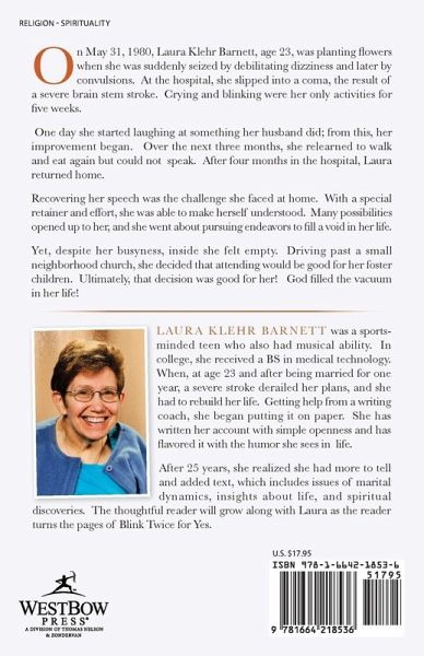 On May 31, 1980, Laura Klehr Barnett, age 23, was planting flowers when she was suddenly seized by debilitating dizziness and later by convulsions. At the hospital, she slipped into a coma, the result of a severe brain stem stroke. Crying and blinking were her only activities for five weeks. One day she started laughing at something her husband did; from this, her improvement began. Over the next three months, she relearned to walk and eat again but could not speak. After four months in the hospital, Laura returned home. Recovering her speech was the challenge she faced at home. With a special retainer and effort, she was able to make herself understood. Many possibilities opened up to her, and she went about pursuing endeavors to fill a void in her life. Yet, despite her busyness, inside she felt empty. Driving past a small neighborhood church, she decided that attending would be good for her foster children. Ultimately, that decision was good for her! God filled the vacuum in her life!