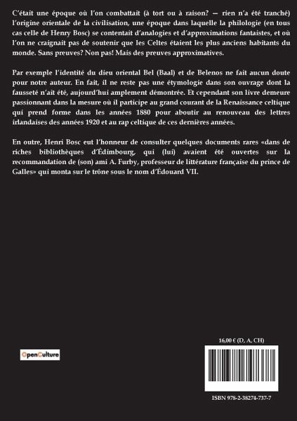 C¿était une époque où l¿on combattait (à tort ou à raison? ¿ rien n¿a été tranché) l¿origine orientale de la civilisation, une époque dans laquelle la philologie (en tous cas celle de Henry Bosc) se contentait d¿analogies et d¿approximations fantaistes, et où l¿on ne craignait pas de soutenir que les Celtes étaient les plus anciens habitants du monde. Sans preuves? Non pas! Mais des preuves approximatives. Par exemple l¿identité du dieu oriental Bel (Baal) et de Belenos ne fait aucun doute pour notre auteur. En fait, il ne reste pas une étymologie dans son ouvrage dont la fausseté n¿ait été, aujourd¿hui amplement démontrée. Et cependant son livre demeure passionnant dans la mesure où il participe au grand courant de la Renaissance celtique qui prend forme dans les années 1880 pour aboutir au renouveau des lettres irlandaises des années 1920 et au rap celtique de ces dernières années. En outre, Henri Bosc eut l¿honneur de consulter quelques documents rares «dans de riches bibliothèques d¿Édimbourg, qui (lui) avaient été ouvertes sur la recommandation de (son) ami A. Furby, professeur de littérature française du prince de Galles» qui monta sur le trône sous le nom d¿Édouard VII.