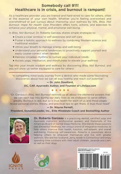 Somebody call 911! Healthcare is in crisis, and burnout is rampant! As a healthcare provider, you are trained and hard-wired to care for others, often at the expense of your own health. Whether you're feeling overworked and overwhelmed or just curious about improving your wellness by 10%, Bliss, Not Burnout: Hope for Health Care Providers offers tools, actions, and exercises to enhance your physical, mental, and emotional well-being. In Bliss, Not Burnout, Dr. Roberta Garceau shares simple strategies to:Create a clear window to self-awareness and self-care Foster a holistic approach to wellness by combining Western science and traditional wisdom Utilize your breath to manage energy and well-being Understand your personal tendencies to proactively support yourself and easily course-correct when needed Harness circadian rhythms to nurture your individual needs Access yoga, meditation, and mindfulness to elevate your wellness Tap into your innate wisdom and wellness by discovering Bliss, Not Burnout, and you will show up better equipped to care for others!