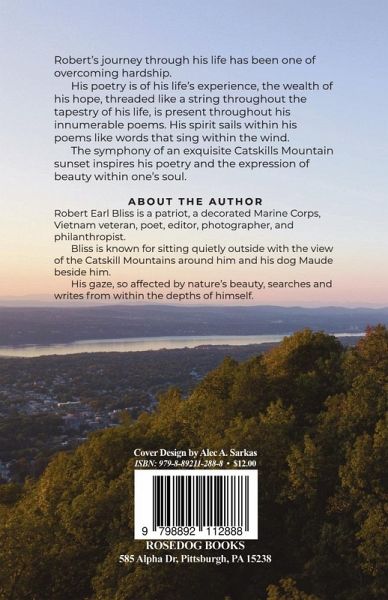 Robert's journey through his life has been one of overcoming hardship. His poetry is of his life's experience, the wealth of his hope, threaded like a string throughout the tapestry of his life, is present throughout his innumerable poems. His spirit sails within his poems like words that sing within the wind. The symphony of an exquisite Catskills Mountain sunset inspires his poetry and the expression of beauty within one's soul. About the Author Robert Earl Bliss is a patriot, a decorated Marine Corps, Vietnam veteran, poet, editor, photographer, and philanthropist. Bliss is known for sitting quietly outside with the view of the Catskill Mountains around him and his dog Maude beside him. His gaze, so affected by nature's beauty, searches and writes from within the depths of himself.