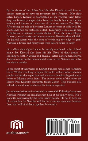 By the decree of her father Stu, Natrisha Kincaid is sold into an abusive marriage to have his monetary debts forgiven. Her older sister, Lenora Kincaid is heartbroken as she watches their father drag her beloved younger sister from the family home in the late evening and thrown into the arms of the town menace, Don Risor. After seeing the sale of her sister, Lenora becomes at odds with Stu and blames him for Natrisha's ordeal. Eventually, Lenora seeks help at Pathways, a battered women's shelter. There she meets Shayna Lawson, a social worker and abuse counselor. Together they will fight the judicial system with the hope of convincing the judge to grant Natrisha a divorce and remove her from Risor's house to safety. On a silent dark night, Lenora is brutally murdered in her father's home. Stu Kincaid also loses his life. News of their deaths is shocking to both Natrisha and Shayna. After Lenora dies, Shayna decides to take on the monumental tasks to free Natrisha and solve her sister's murder. In the midst of their trials, an English business man comes to Miami. Carter Wesley is looking to expand his multi-million dollar real estate empire and decides to purchase and renovate a deteriorating residential tower on Miami's ocean front. The current owner of the tower, the shrewd Paul Kolinsky, frequently taunts Carter. This business deal will add more drama to Carter's life than he expected. Just minutes before he is scheduled to meet with Kolinsky, Carter sees Natrisha working the breakfast rush hour at his luxury hotel. He is instantly mesmerized by the raven-haired beauty. He has to have her. His attraction for Natrisha will lead to a steamy encounter between them that will bind them together for eternity.