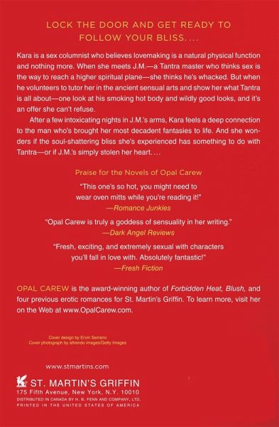 Lock the door and get ready to follow your bliss... Kara is a sex columnist who believes lovemaking is a natural physical function and nothing more. When she meets a J.M-a Tantra master who thinks sex is the way to reach a higher spiritual plane-she thinks he's whacked. But when he volunteers to tutor her in the ancient sensual arts and show her what Tantra is all about-one look at his smoking hot body and wildly good looks, and it's an offer she can't refuse. After a few intoxicating nights in J.M.'s arms, Kara feels a deep connection to the man who's brought her most decadent fantasies to life. And she wonders if the soul-shattering bliss she's experienced has something to do with Tantra--or if J.M.'s simply stolen her heart...