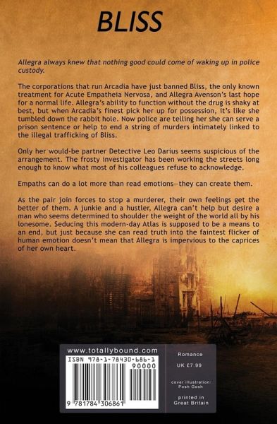 Allegra always knew that nothing good could come of waking up in police custody. The corporations that run Arcadia have just banned Bliss, the only known treatment for Acute Empatheia Nervosa, and Allegra Avenson's last hope for a normal life. Allegra's ability to function without the drug is shaky at best, but when Arcadia's finest pick her up for possession, it's like she tumbled down the rabbit hole. Now police are telling her she can serve a prison sentence or help to end a string of murders intimately linked to the illegal trafficking of Bliss. Only her would-be partner Detective Leo Darius seems suspicious of the arrangement. The frosty investigator has been working the streets long enough to know what most of his colleagues refuse to acknowledge. Empaths can do a lot more than read emotions-they can create them. As the pair join forces to stop a murderer, their own feelings get the better of them. A junkie and a hustler, Allegra can't help but desire a man who seems determined to shoulder the weight of the world all by his lonesome. Seducing this modern-day Atlas is supposed to be a means to an end, but just because she can read truth into the faintest flicker of human emotion doesn't mean that Allegra is impervious to the caprices of her own heart.