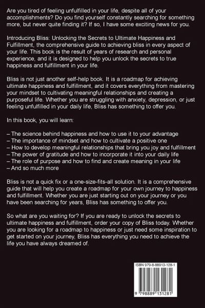 Are you tired of feeling unfulfilled in your life, despite all of your accomplishments? Do you find yourself constantly searching for something more, but never quite finding it? If so, I have some exciting news for you. Introducing Bliss: Unlocking the Secrets to Ultimate Happiness and Fulfillment, the comprehensive guide to achieving bliss in every aspect of your life. This book is the result of years of research and personal experience, and it is designed to help you unlock the secrets to true happiness and fulfillment in your life. Bliss is not just another self-help book. It is a roadmap for achieving ultimate happiness and fulfillment, and it covers everything from mastering your mindset to cultivating meaningful relationships and creating a purposeful life. Whether you are struggling with anxiety, depression, or just feeling unfulfilled in your daily life, Bliss has something to offer you. In this book, you will learn: - The science behind happiness and how to use it to your advantage - The importance of mindset and how to cultivate a positive one - How to develop meaningful relationships that bring you joy and fulfillment - The power of gratitude and how to incorporate it into your daily life - The role of purpose and how to find and create meaning in your life - And so much more Bliss is not a quick fix or a one-size-fits-all solution. It is a comprehensive guide that will help you create a roadmap for your own journey to happiness and fulfillment. Whether you are just starting out on your journey or you have been searching for years, Bliss has something to offer you. So what are you waiting for? If you are ready to unlock the secrets to ultimate happiness and fulfillment, order your copy of Bliss today. Whether you are looking for a roadmap to happiness or just need some inspiration to get started on your journey, Bliss has everything you need to achieve the life you have always dreamed of.