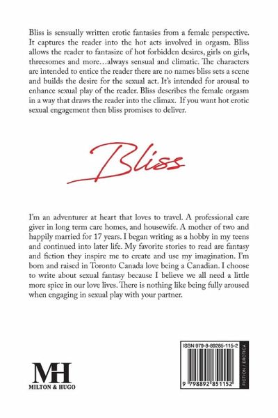 Bliss is sensually written erotic fantasies from a female perspective. It captures the reader into the hot acts involved in orgasm. Bliss allows the reader to fantasize of hot forbidden desires, girls on girls, threesomes and more...always sensual and climatic. The characters are intended to entice the reader there are no names bliss sets a scene and builds the desire for the sexual act. It's intended for arousal to enhance sexual play of the reader. Bliss describes the female orgasm in a way that draws the reader into the climax. If you want hot erotic sexual engagement then bliss promises to deliver.