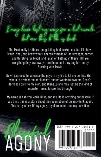 I may have lost my way for a hot minute, but now this b*tch is back. The Mckinnelly brothers thought they had broken me, but I'll show Travis, Noel, and Drew what I am really made of. I'm stronger, harder, and thirsting for blood, and I plan on bathing in theirs. I'll take everything they love away from them until they beg for mercy. Starting with Travis. Now I just need to convince the guys in my life to let me do this. Storm wants to protect me at all costs, Hunter wants to own me, Coop's darkness calls to my own, and Blane...Blane may just be the kind of monster I need to see this through. My name is Ashlynn Marie Bliss, and my life is anything but blissful. If you think this is a story about the redemption of bullies--think again. This is my story. Of my agony, my damnation, and my salvation. **This book is a Why Choose Dark Romance. It touches on subjects like sexual assault, suicide, and self-harm. It also has explicit sex scenes between consenting adults. If this is not your cup of tea you may not want to read this book. But know that the FMC gets revenge on those that have wronged her, it's a story of finding oneself through all the heartache and pain that real life can bring you.**