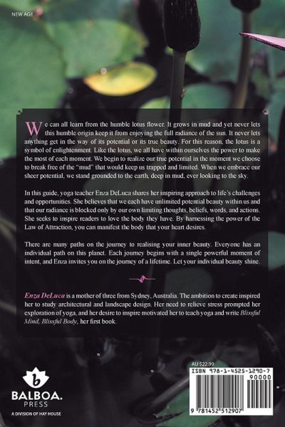 We can all learn from the humble lotus flower. It grows in mud and yet never lets this humble origin keep it from enjoying the full radiance of the sun. It never lets anything get in the way of its potential or its true beauty. For this reason, the lotus is a symbol of enlightenment. Like the lotus, we all have within ourselves the power to make the most of each moment. We begin to realize our true potential in the moment we choose to break free of the "mud" that would keep us trapped and limited. When we embrace our sheer potential, we stand grounded to the earth, deep in mud, ever looking to the sky. In this guide, yoga teacher Enza DeLuca shares her inspiring approach to life's challenges and opportunities. She believes that we each have unlimited potential beauty within us and that our radiance is blocked only by our own limiting thoughts, beliefs, words, and actions. She seeks to inspire readers to love the body they have. By harnessing the power of the Law of Attraction, you can manifest the body that your heart desires. There are many paths on the journey to realising your inner beauty. Everyone has an individual path on this planet. Each journey begins with a single powerful moment of intent, and Enza invites you on the journey of a lifetime. Let your individual beauty shine.
