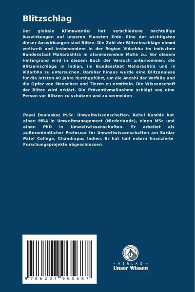 Der globale Klimawandel hat verschiedene nachteilige Auswirkungen auf unseren Planeten Erde. Eine der wichtigsten dieser Auswirkungen sind Blitze. Die Zahl der Blitzeinschläge nimmt weltweit und insbesondere in der Region Vidarbha im indischen Bundesstaat Maharashtra in alarmierendem Maße zu. Vor diesem Hintergrund wird in diesem Buch der Versuch unternommen, die Blitzeinschläge in Indien, im Bundesstaat Maharashtra und in Vidarbha zu untersuchen. Darüber hinaus wurde eine Blitzanalyse für die letzten 40 Jahre durchgeführt, um die Anzahl der Vorfälle und die Opfer von Menschen und Tieren zu ermitteln. Die Wissenschaft der Blitze wird erklärt. Die Präventivmaßnahme schlägt vor, eine Person vor Blitzen zu schützen und zu vermeiden .