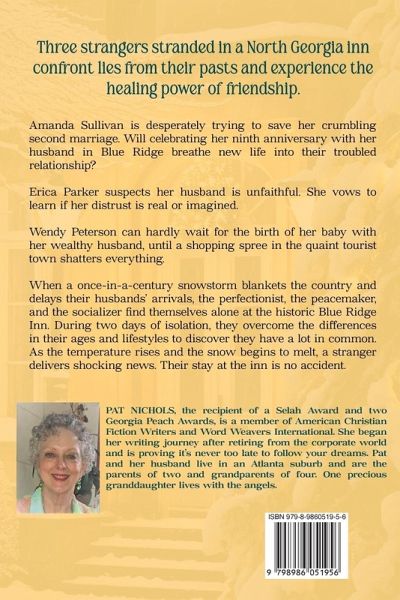 Three strangers stranded in a North Georgia inn confront lies from their pasts and experience the healing power of friendship. Amanda Sullivan is desperately trying to save her crumbling second marriage. Will celebrating her ninth anniversary with her husband in Blue Ridge breathe new life into their troubled relationship? Erica Parker suspects her husband is unfaithful. She vows to learn if her distrust is real or imagined. Wendy Peterson can hardly wait for the birth of her baby with her wealthy husband, until a shopping spree in the quaint tourist town shatters everything. When a once-in-a-century snowstorm blankets the country and delays their husbands' arrivals, the perfectionist, the peacemaker, and the socializer find themselves alone at the historic Blue Ridge Inn. During two days of isolation, they overcome the differences in their ages and lifestyles to discover they have a lot in common. As the temperature rises and the snow begins to melt, a stranger delivers shocking news. Their stay at the inn is no accident. A celebration of the bond that develops between women when lives are turned upside down. If you enjoy stories by Robyn Carr, Katie Winters, and Maggie Miller, you'll love this new women's fiction series.