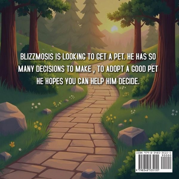 Blizzmosis Wants to Get a Pet by Fuzzy Boots is a delightful and heartwarming tale for young readers! ����✨ Meet Blizzmosis, a lovable fuzzy bear who lives in a cozy home surrounded by tall pine trees ����, a tranquil pond ����, and plenty of woodland friends ��������. But something is missing-a special pet to keep him company! ���� Join Blizzmosis on a whimsical adventure as he explores which pet would be just right for him. �������� From dogs and pigs to bats and fish, Blizzmosis humorously considers all the possibilities. With charming rhymes ���� and vivid imagination ����, this story will have children giggling as they discover what makes a pet truly special. When inspiration strikes, Blizzmosis finds the perfect companion to cuddle with, play with, and enjoy for many happy years. ����❤️ This sweet and entertaining story celebrates the joy of friendship and sparks creativity and laughter for young readers. Perfect for bedtime reading �������� or introducing children to the idea of pet ownership, Blizzmosis Wants to Get a Pet is a must-have for families who adore animals �������� and cherish adorable stories! ����✨