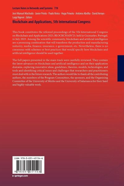 This book constitutes the refereed proceedings of the 5th International Congress on Blockchain and Applications 2023, BLOCKCHAIN'23, held in Guimarães, Portugal, in July 2023. Among the scientific community, blockchain and artificial intelligence are a promising combination that will transform the production and manufacturing industry, media, finance, insurance, e-government, etc. Nevertheless, there is no consensus with schemes or best practices that would specify how blockchain and artificial intelligence should be used together.