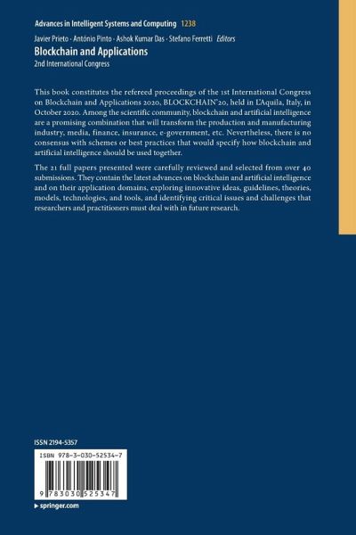 This book constitutes the refereed proceedings of the 1st International Congress on Blockchain and Applications 2020, BLOCKCHAIN'20, held in L'Aquila, Italy, in October 2020. Among the scientific community, blockchain and artificial intelligence are a promising combination that will transform the production and manufacturing industry, media, finance, insurance, e-government, etc. Nevertheless, there is no consensus with schemes or best practices that would specify how blockchain and artificial intelligence should be used together.