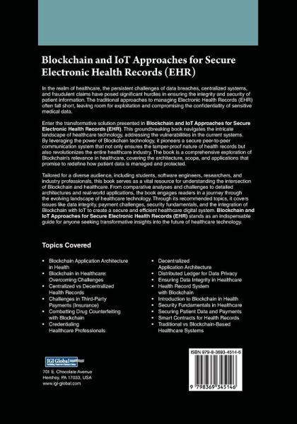 In the realm of healthcare, the persistent challenges of data breaches, centralized systems, and fraudulent claims have posed significant hurdles in ensuring the integrity and security of patient information. The traditional approaches to managing Electronic Health Records (EHR) often fall short, leaving room for exploitation and compromising the confidentiality of sensitive medical data. Enter the transformative solution presented in Blockchain and IoT Approaches for Secure Electronic Health Records (EHR). This groundbreaking book navigates the intricate landscape of healthcare technology, addressing the vulnerabilities in the current systems. By leveraging the power of Blockchain technology, it pioneers a secure peer-to-peer communication system that not only ensures the tamper-proof nature of health records but also revolutionizes the entire healthcare industry. The book is a comprehensive exploration of Blockchain's relevance in healthcare, covering the architecture, scope, and applications that promise to redefine how patient data is managed and protected.