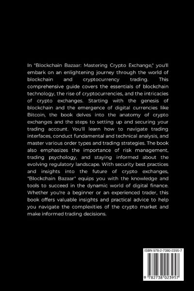 In "Blockchain Bazaar: Mastering Crypto Exchange," you'll embark on an enlightening journey through the world of blockchain and cryptocurrency trading. This comprehensive guide covers the essentials of blockchain technology, the rise of cryptocurrencies, and the intricacies of crypto exchanges. Starting with the genesis of blockchain and the emergence of digital currencies like Bitcoin, the book delves into the anatomy of crypto exchanges and the steps to setting up and securing your trading account. You'll learn how to navigate trading interfaces, conduct fundamental and technical analysis, and master various order types and trading strategies. The book also emphasizes the importance of risk management, trading psychology, and staying informed about the evolving regulatory landscape. With security best practices and insights into the future of crypto exchanges, "Blockchain Bazaar" equips you with the knowledge and tools to succeed in the dynamic world of digital finance. Whether you're a beginner or an experienced trader, this book offers valuable insights and practical advice to help you navigate the complexities of the crypto market and make informed trading decisions.