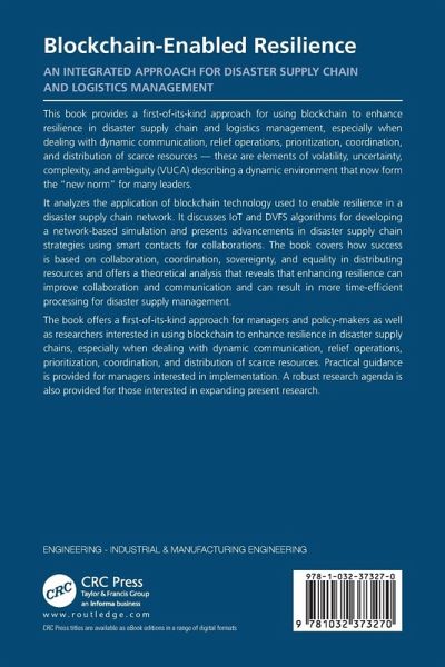 This book provides a first-of-its-kind approach for managers and policy-makers as well as researchers interested in using blockchain to enhance resilience in disaster supply chains, especially when dealing with dynamic communication, relief operations, prioritization, coordination, and distribution of scarce resources.