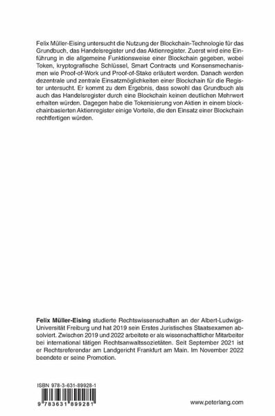 Felix Müller-Eising untersucht die Nutzung der Blockchain-Technologie für das Grundbuch, das Handelsregister und das Aktienregister. Zuerst wird eine Einführung in die allgemeine Funktionsweise einer Blockchain gegeben, wobei Token, kryptografische Schlüssel, Smart Contracts und Konsensmechanismen wie Proof-of-Work und Proof-of-Stake erläutert werden. Danach werden dezentrale und zentrale Einsatzmöglichkeiten einer Blockchain für die Register untersucht. Er kommt zu dem Ergebnis, dass sowohl das Grundbuch als auch das Handelsregister durch eine Blockchain keinen deutlichen Mehrwert erhalten würden. Dagegen habe die Tokenisierung von Aktien in einem blockchainbasierten Aktienregister einige Vorteile, die den Einsatz einer Blockchain rechtfertigen würden.